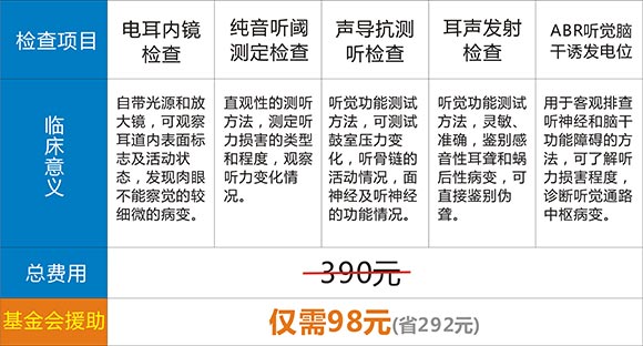 此次活动由中国五官科健康基金会对耳部疾病的人群进行基金援助, 听力全套检查(电耳内镜检查、纯音听阀测定检查、声导抗测听检查、耳声发射检查、ABR听觉脑干诱发电位检查)一共390元,申请参与活动成功后,只需98元即可享受专业全面的耳鼻喉检查。