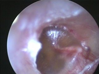 上面这张显示的是一例慢性分泌性中耳炎的鼓膜图片,鼓膜不透明,如毛玻璃状,鼓膜紧张部有扩张的微血管,多提示鼓室内的为非常粘稠的积液。