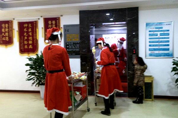 一大早,西安中大耳鼻喉医院后勤处就开始忙碌,安排人员采办物资、准备礼品,制定计划,分配各自工作任务……整个上午马不停蹄。中午1点半,换好服装,推着精心准备的礼物,圣诞老人降临医院,完成了这一场有预谋的惊喜事件。