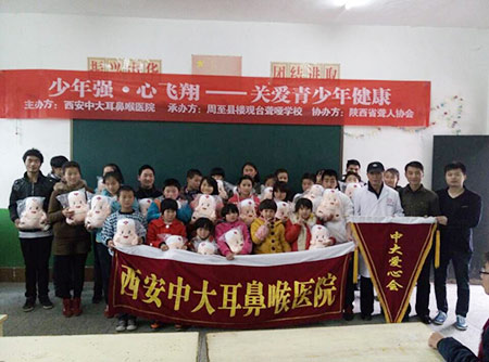 11月10日,陕西聋人协会牵头,西安中大耳鼻喉医院志愿者前往周至县楼观台聋哑学校开展“少年强·心飞翔--关注青少年健康”活动,对学生进行爱心授课,并向学校捐赠“爱心物资”,给聋哑儿童送去关爱和温情。