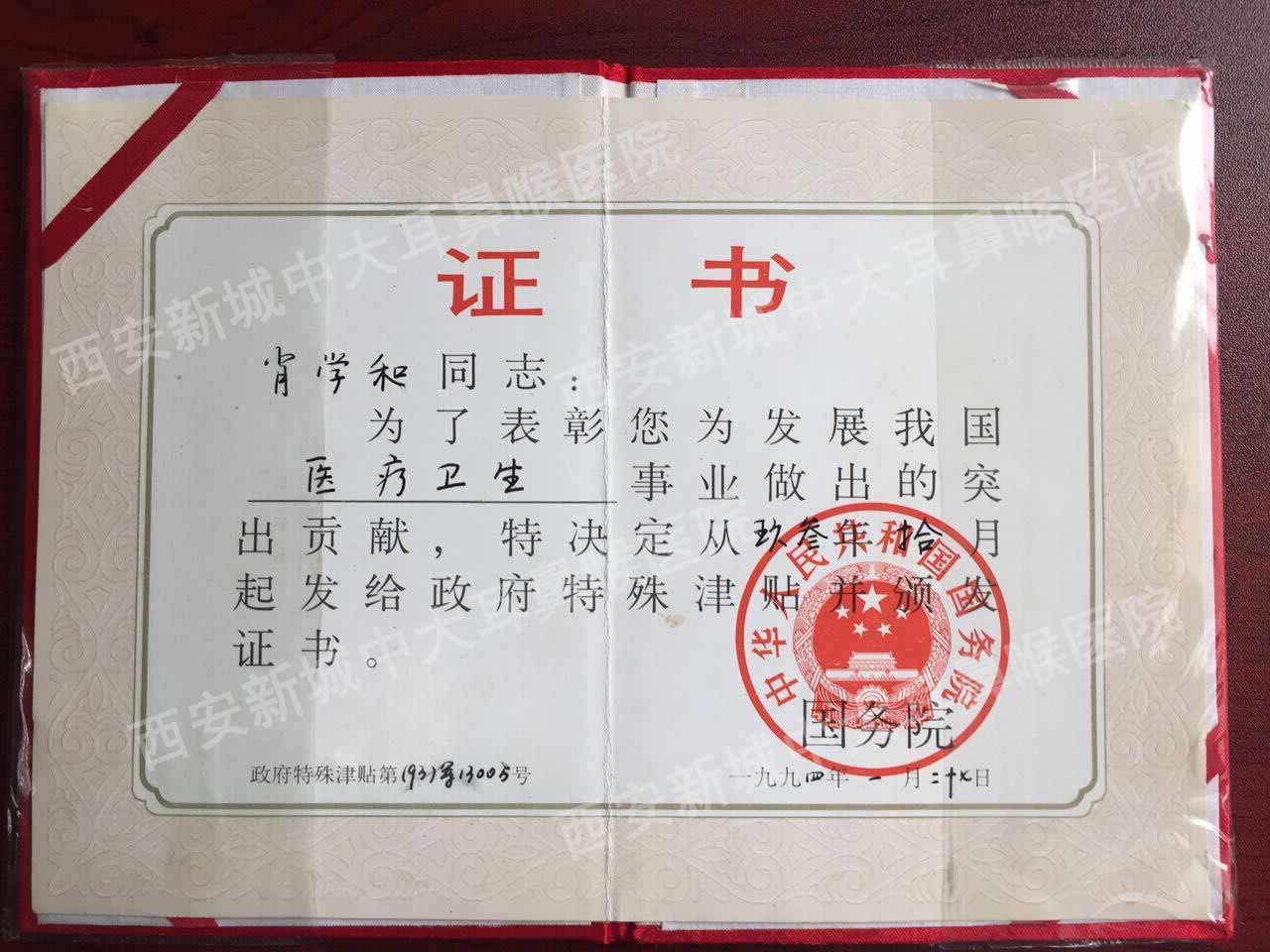 1990年,党中央、国务院决定,给做出突出贡献的专家、学者、技术人员发放政府特殊津贴。肖学和教授作为耳科学科领域带头人荣获国务院首批特殊津贴奖。